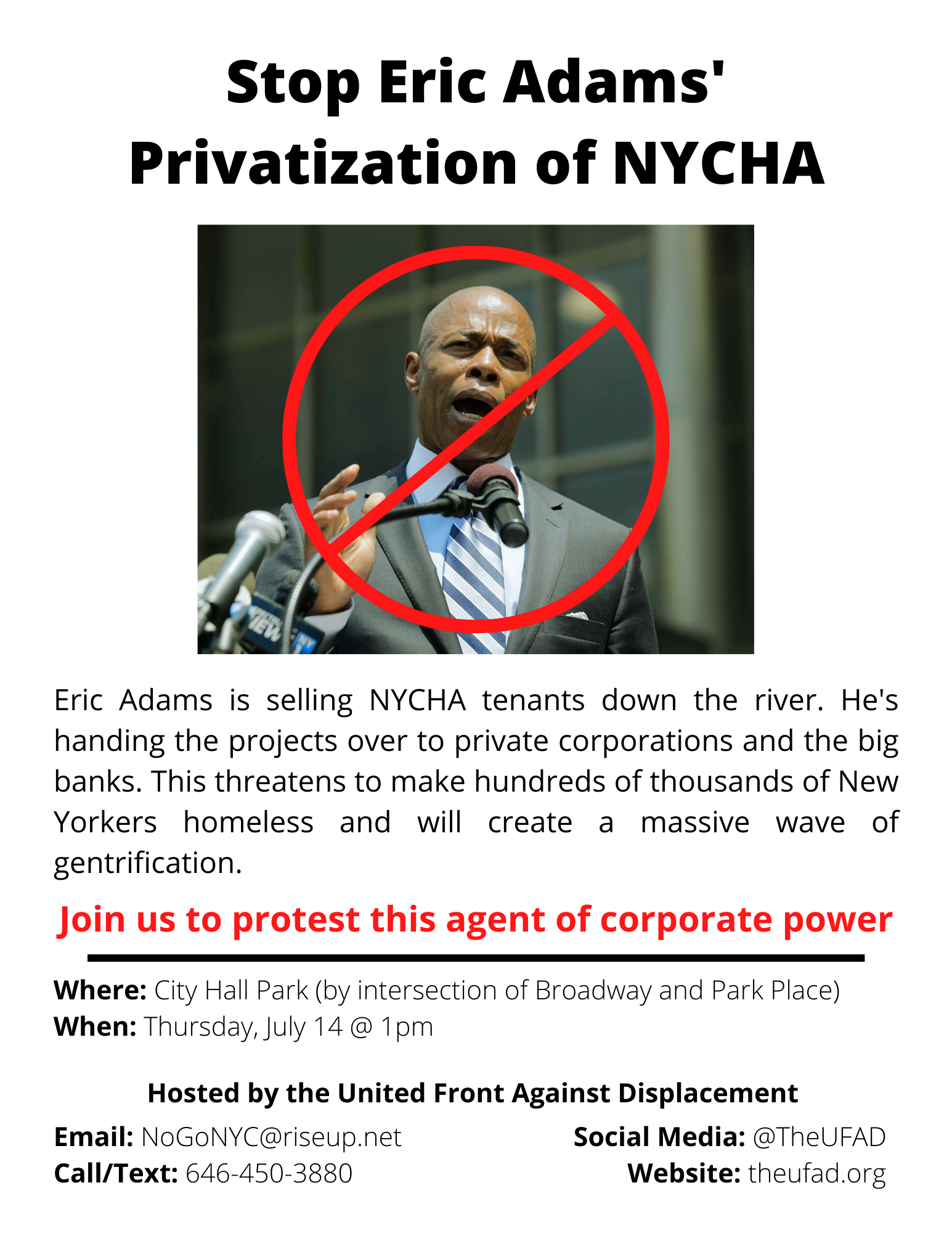 - Coney Island NYCHA Tenants Protest Privatization on February 5th, Release PetitionЧитать на русском языке / Read in Russian For immediate release: Monday, January 30th, 2023 What: Coney Island NYCHA Tenants Protest Privatization, Release PetitionWhere: West 24th Street and Surf Avenue outside NYCHA Haber Houses, Coney Island, BrooklynWhen: 12:00pm on Sunday, February 5th, 2023Contact: United Front Against Displacement, 646-450-3880, nogoNYC@riseup.net On Sunday, February 5th, United FrontContinue reading “Coney Island NYCHA Tenants Protest Privatization on February 5th, Release Petition”