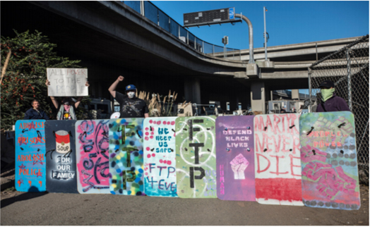 The following week, residents were once again told they had to move out, this time by Oakland Police Captain, Bobby Hookfin. They were told they had until November 13, 2020. On that day, private contractors had heavy equipment ready to dismantle residents’ homes. The residents refused to move without a cash settlement so when police arrived, several people formed a barricade using wooden shields to protect the residents. The police left and Fred Craves’s private security and contractors were left without police backup so they in turn cleared the scene and no one was removed from their home.