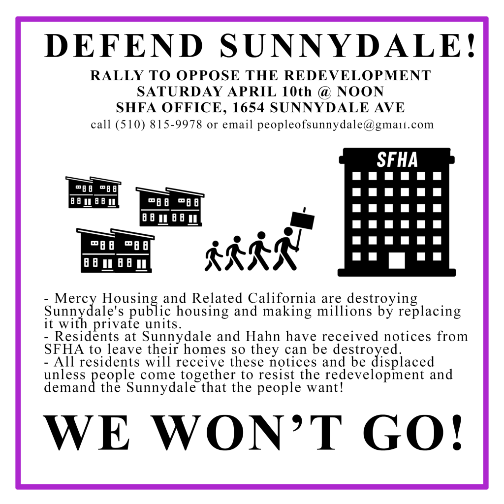 On Saturday, April 10th at 12pm at 1654 Sunnydale Avenue, in front of the San Francisco Housing Authority office at Sunnydale, residents of the Sunnydale housing projects will hold a protest to oppose the HOPE SF plan to privatize and redevelop all of Sunnydale. The SFHA, Mercy Housing, and Related California plan to demolish residents’ homes and replace them with mixed income Mercy Housing units. In other words, the plan is to eliminate public housing through privatization.
