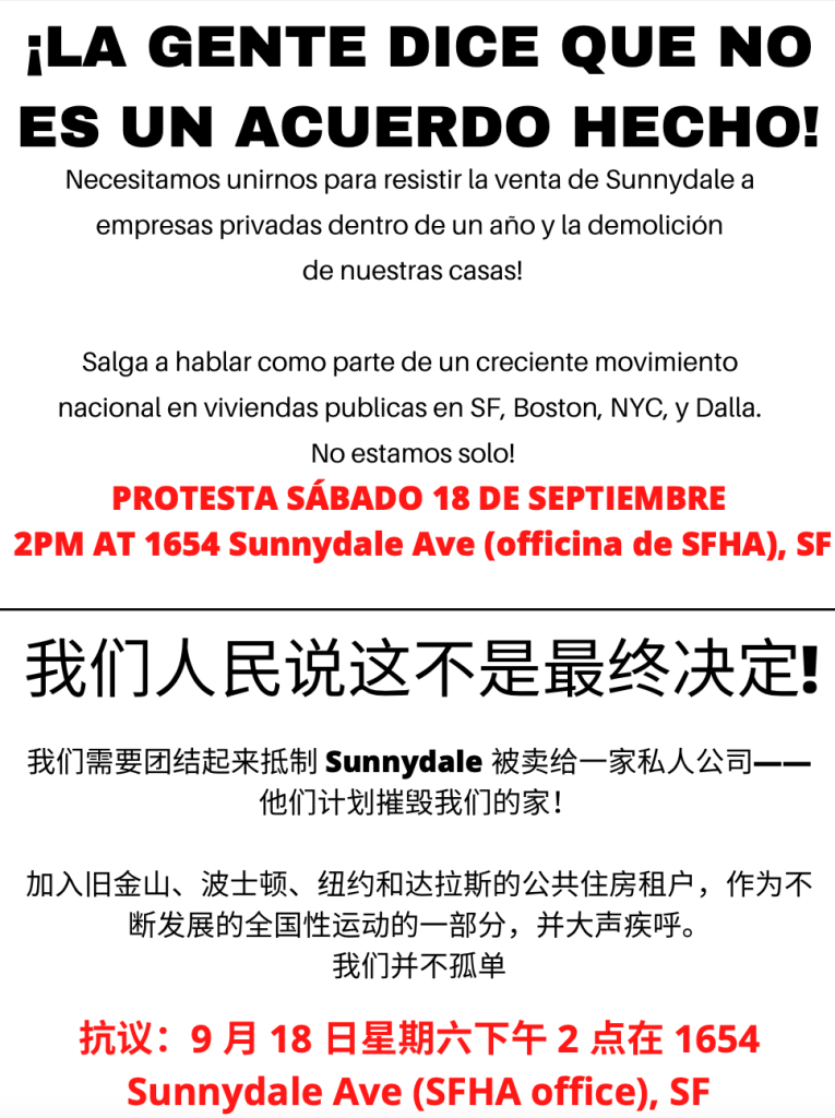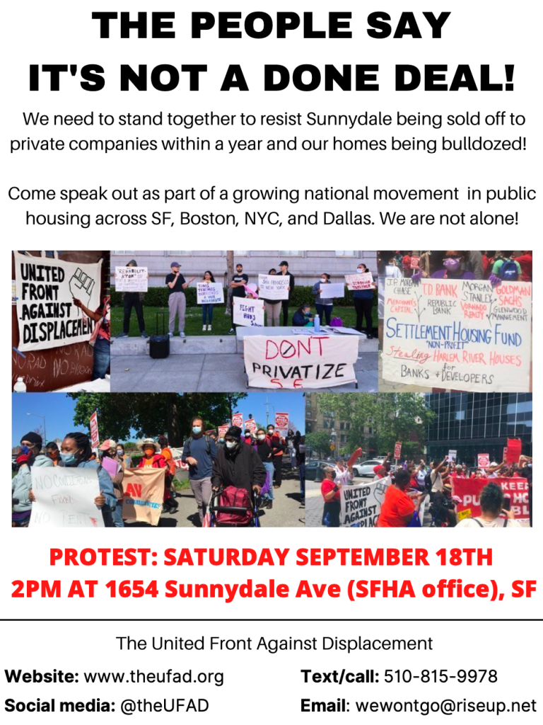On Saturday September 18 at 2pm, resident organizers from Sunnydale public housing and the United Front Against Displacement will convene a rally outside the local San Francisco Housing Authority office at 1654 Sunnydale Ave to denounce recent attempts to push out residents from their homes. At the end of August, SFHA informed dozens of families that they had to leave their homes by November 1 of this year or face eviction. These housing units are slated for demolition to clear the land for developers Mercy Housing and Related California to continue building a “mixed income development” under a city privatization scheme called HOPE SF.