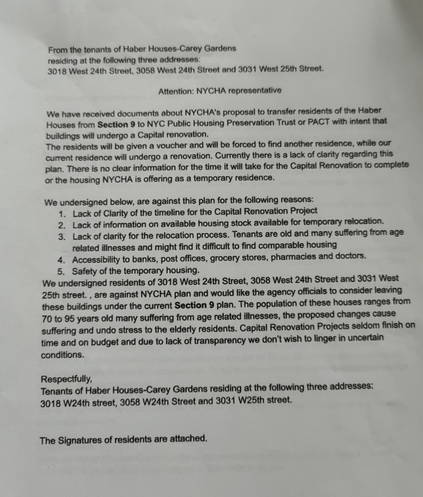We undersigned residents of 3018 West 24th Street, 3058 West 24th Street and 3031 West 25th street, are against NYCHA plan and would like the agency officials to consider leaving these buildings under the current Section 9 plan. The population of these houses ranges from 70 to 95 years old many suffering from age related illnesses, the proposed changes cause suffering and undue stress to the elderly residents. Capital Renovation Projects seldom finish on time and on budget and due to lack of transparency we don’t wish to linger in uncertain conditions.