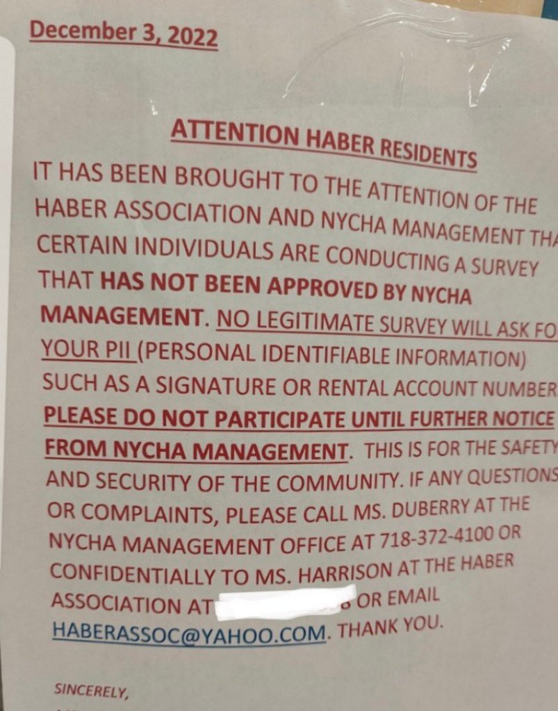 Tenants have faced retaliation from the Haber Tenant Association and NYCHA management. Despite NYCHA’s claim that it cares about tenants’ opinions and right to organize, flyers posted around Haber Houses said it was illegitimate and dangerous for tenants to collect signatures on “a survey that has not been approved by NYCHA management.” Officials have refused to answer basic questions about privatization at NYCHA meetings, especially from non-English speakers.